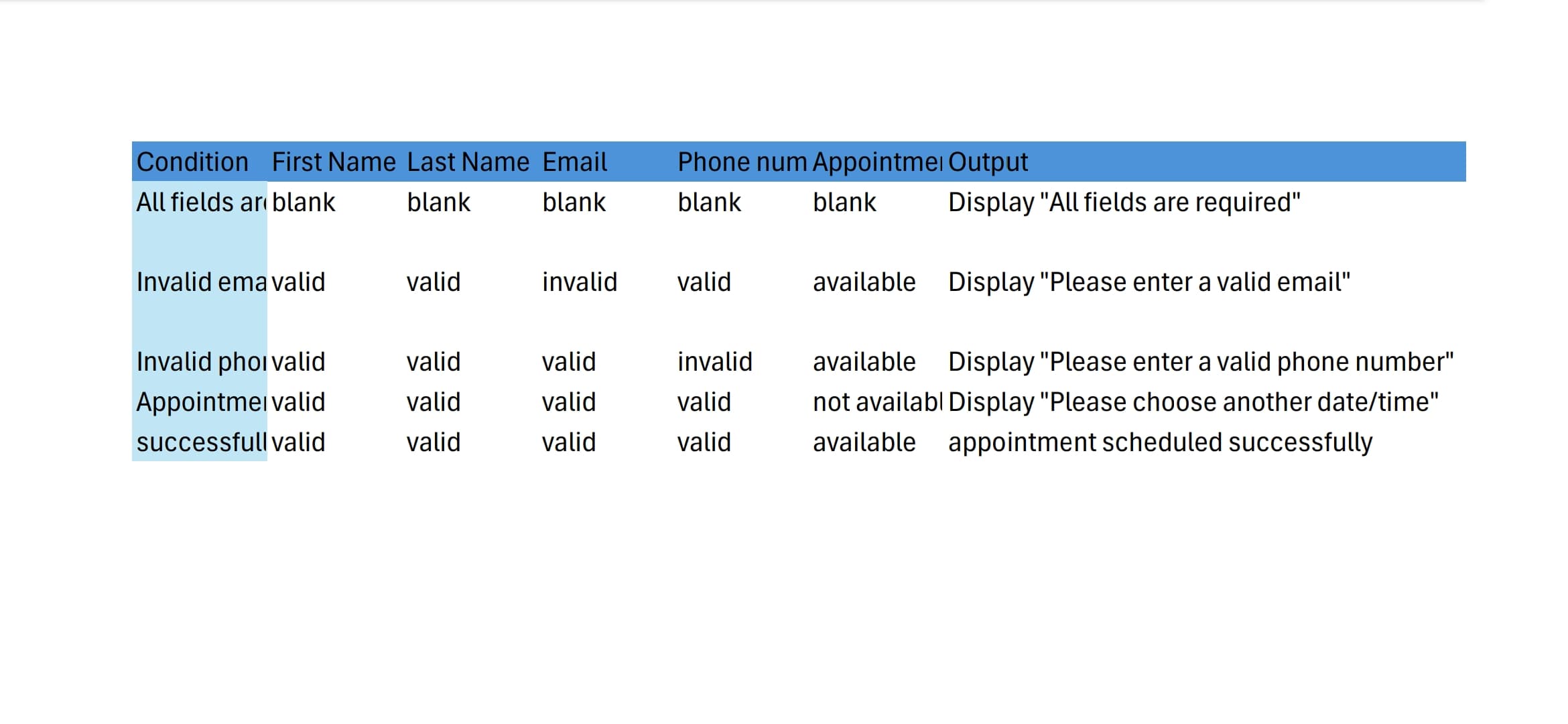 Q1.You are testing a form that allows users to schedule appointments with a doctor. The form has the following fields: first name, last name, email, phone number, and appointment date/time. Some more inputs: 1.If any field is blank, we should display...