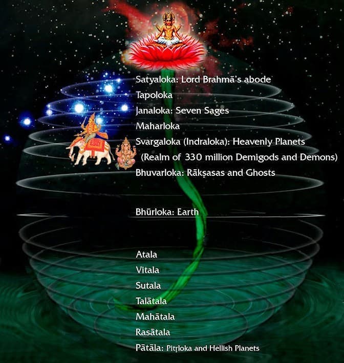 In Hinduism, the universe is described as comprising multiple realms of existence known as Lokas. According to the Puranas and the Atharvaveda, There are Fourteen Distinct Lokas, divided into seven hi