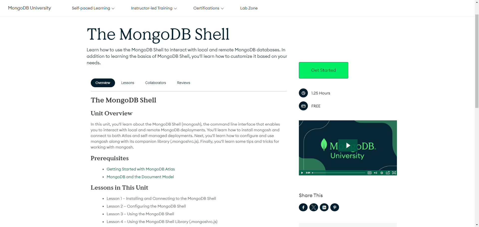 Overview In this unit, you'll learn about the MongoDB Shell (mongosh), the command line interface that enables you to interact with local and remote MongoDB deployments. You'll learn how to install mongosh and connect to both Atlas and self-managed d...