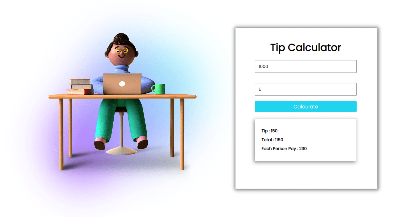I've created this amazing tip calculator. It helps us to calculate tip to be given and to calculate equal distributions.