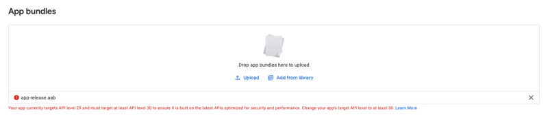 Trying to upload an API level 29 and play store console throws an error?