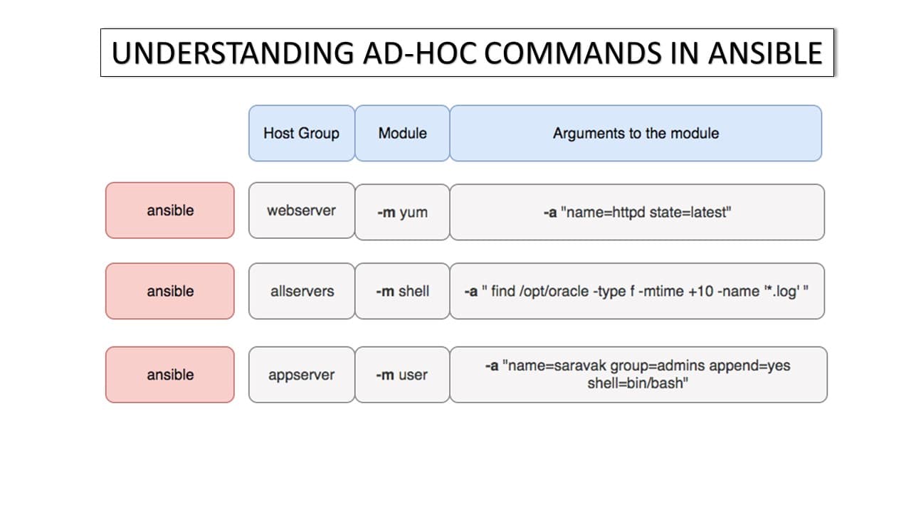 Ansible ad hoc commands are one-liners designed to achieve a very specific task they are like quick snippets and your compact Swiss army knife when you want to do a quick task across multiple machines. To put simply, Ansible ad hoc commands are one-l...