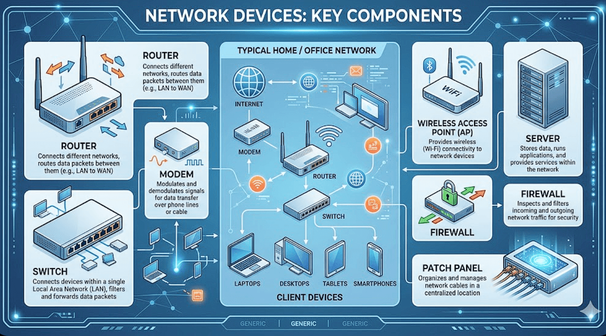 Hi folks, in this blog, we will learn about different netwrok devices. So, let's begin. What is a Modem and how it connects your network to the internet? A modem is a device that connects our home to
