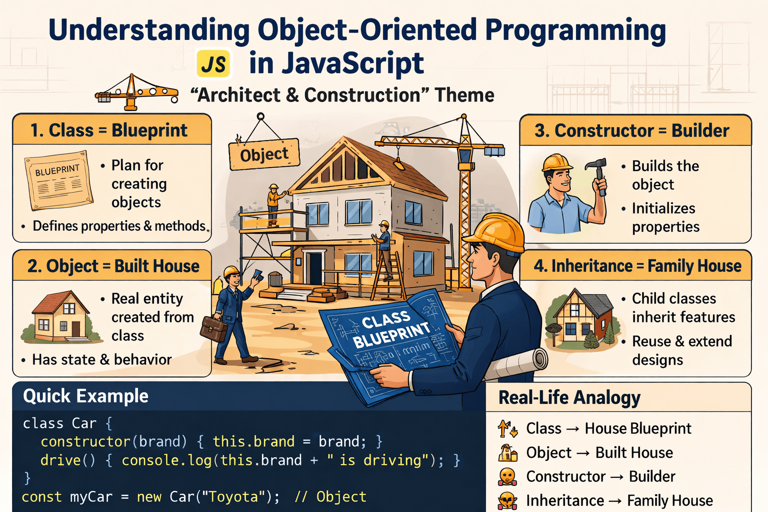The Blueprint and the Building — What is OOP? 🏗️ Imagine you are a world-class Architect. You want to build a new type of modern house. You don’t just start laying bricks randomly. First, you create