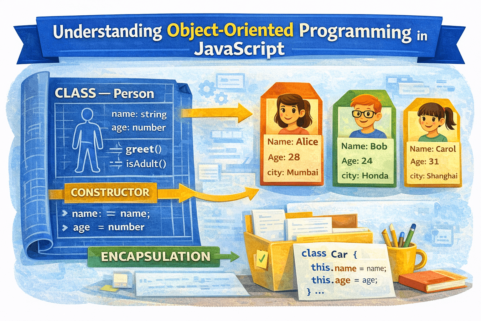 OOP is a way of organising your code around real-world things — cars, students, bank accounts. Instead of scattered variables and functions, everything that belongs together stays together. What is OO