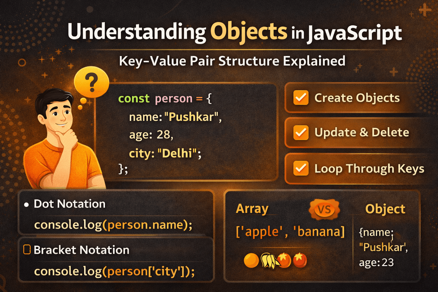 Objects are one of the most important concepts in JavaScript. They help us store and organize related information together. 1. What Objects Are and Why They Are Needed An object is a collection of key