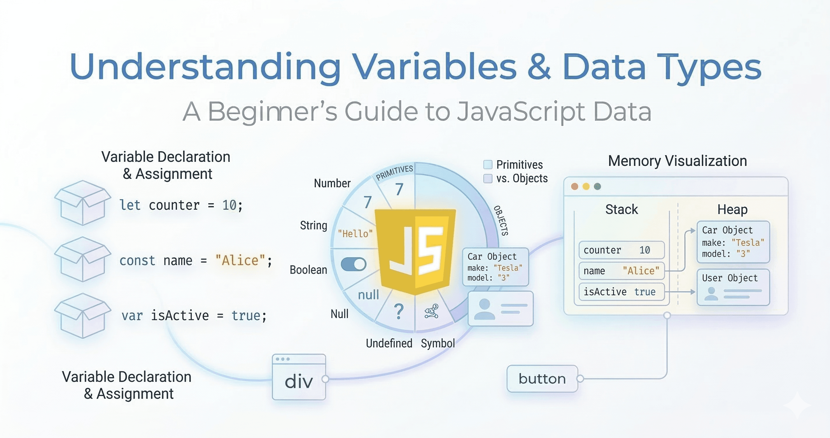 When we start learning JavaScript, one of the first things we encounter is variables and data types. They are the foundation of programming because they allow us to store and work with information. Le