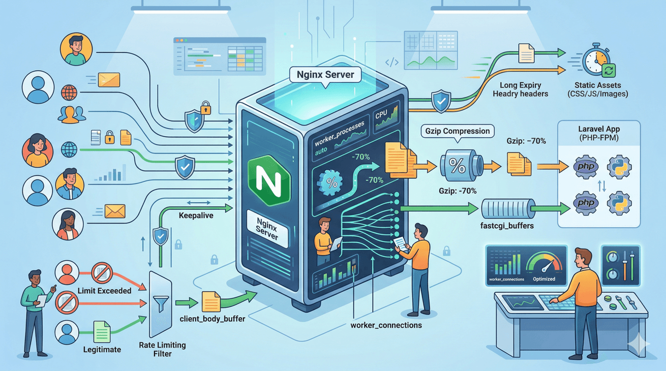 Join discussion3d ago · 9 min read · Nginx sits between your users and your Laravel application, handling every request before PHP sees it. A well-configured Nginx serves static assets without touching PHP, compresses responses to reduce bandwidth, and manages connections efficiently so...